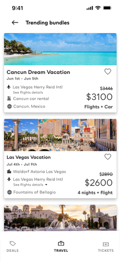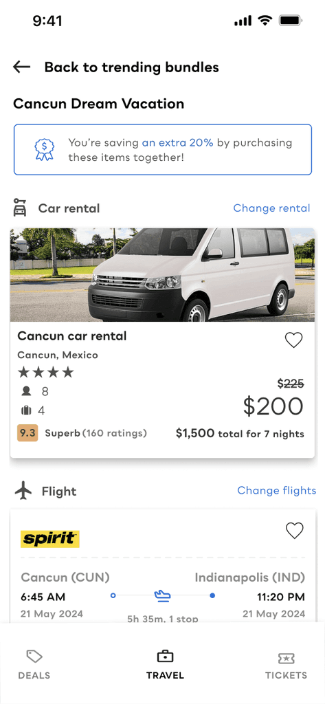 Figure: Users can build customized bundles by combining flights, hotels, rentals, and activities into one unified flow.