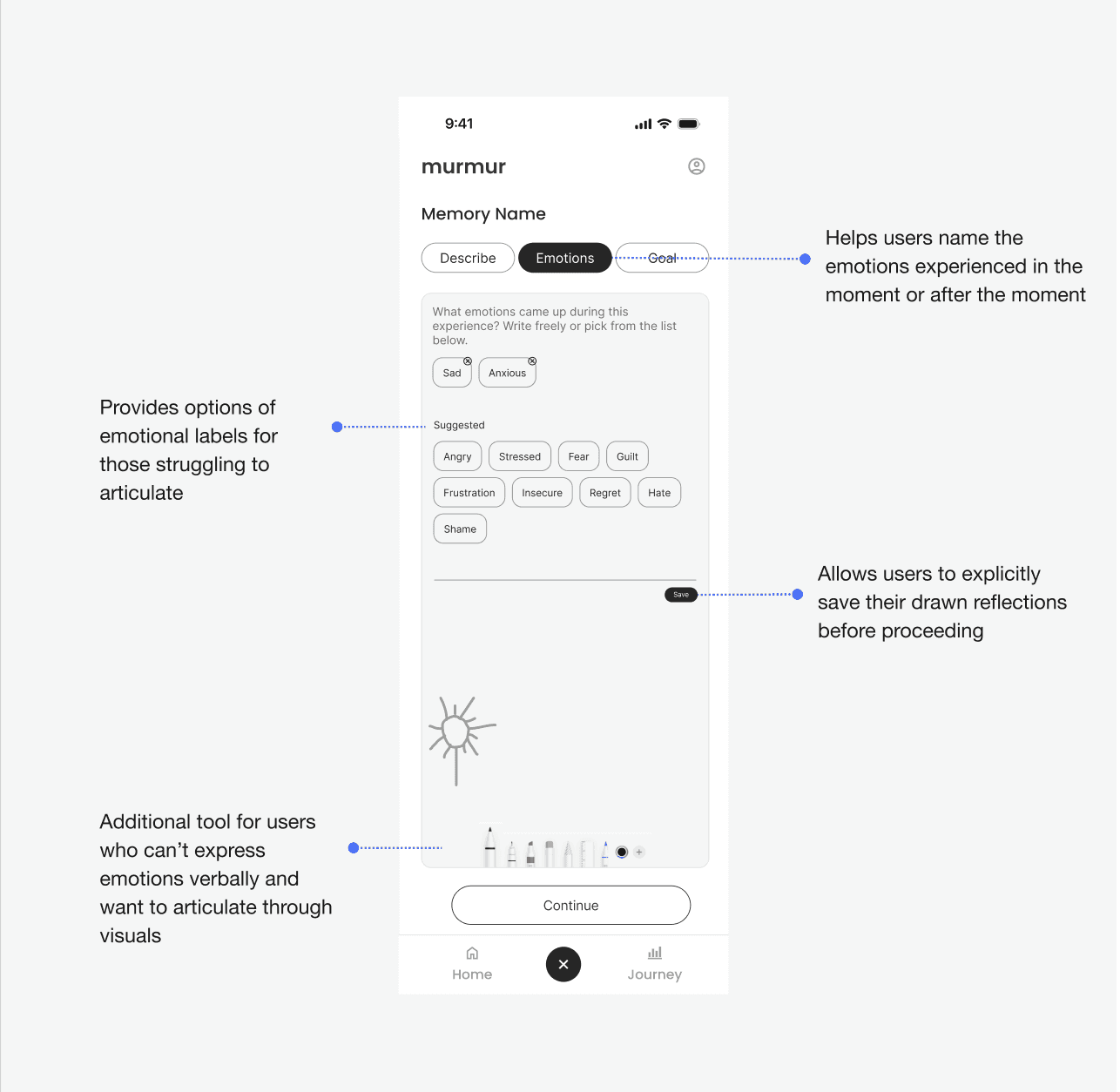This screen supports users in identifying and labeling the emotions tied to the memory they described. Users can enter freeform emotional reflections or select from suggested emotional tags.