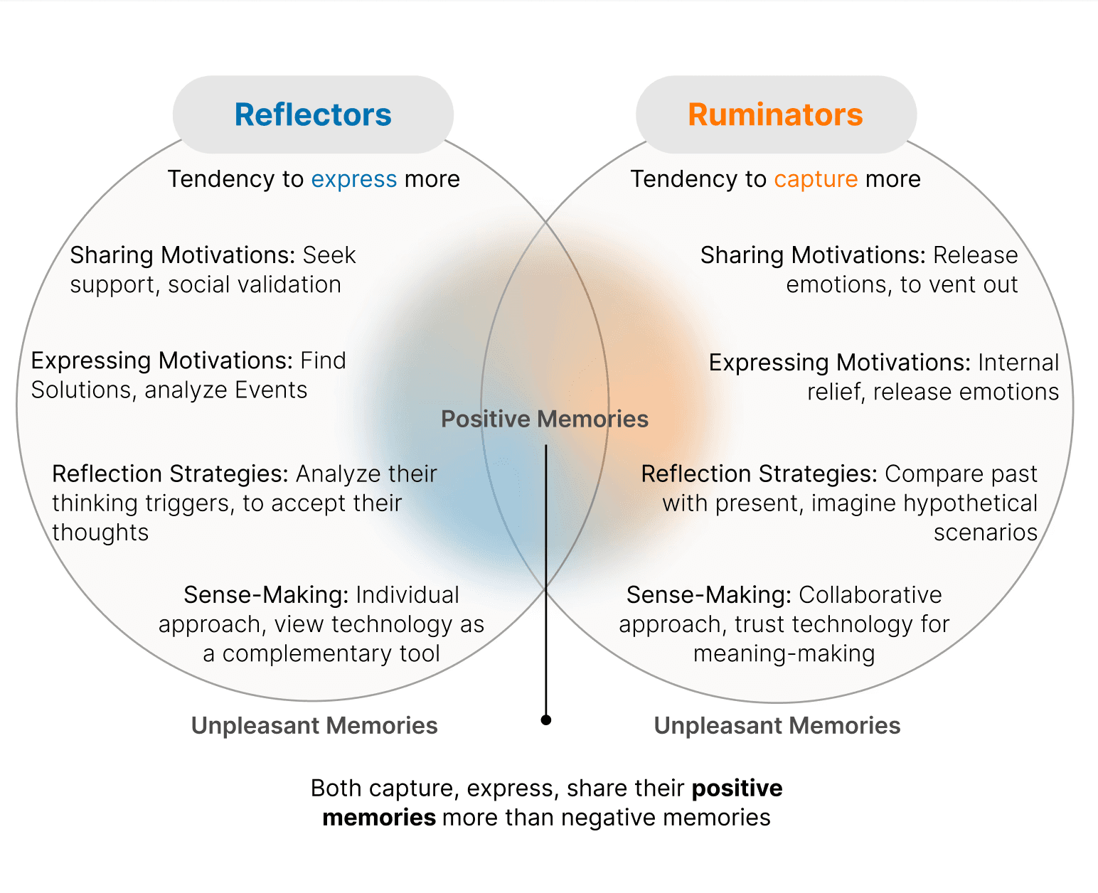 They engage with memory technologies differently. Reflectors do not trust the effect of technology, and they have a separate processing phase, while ruminators prefer expressive outlets and need to communicate with others, in addition to trusting the influence of technology