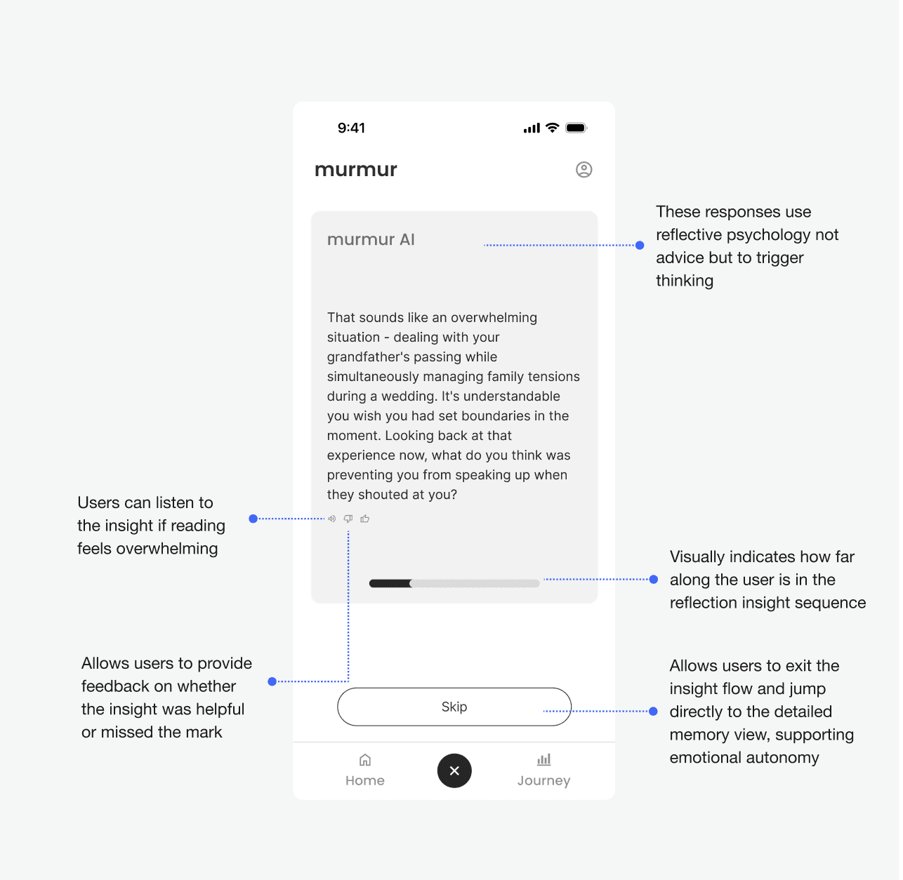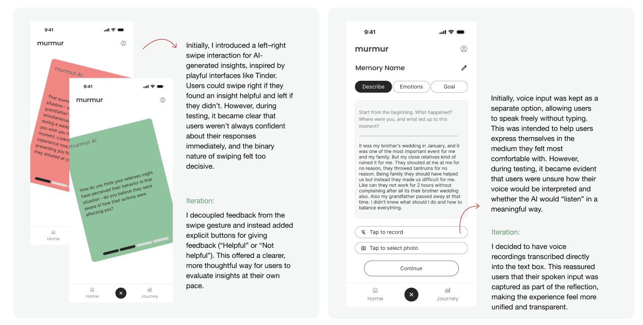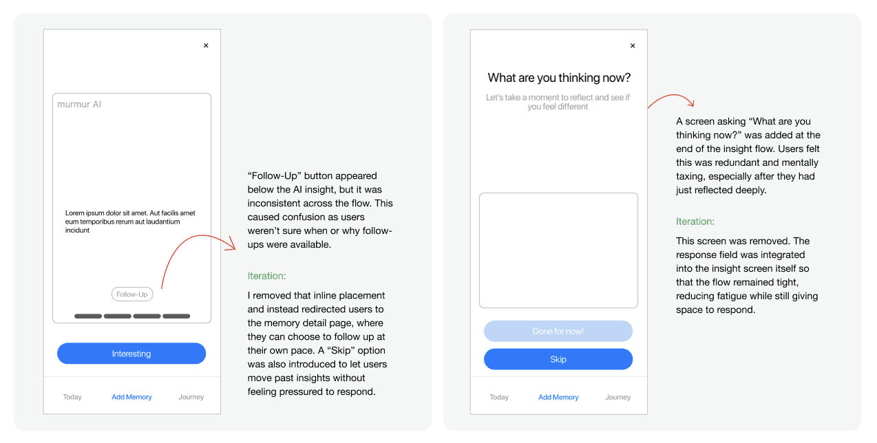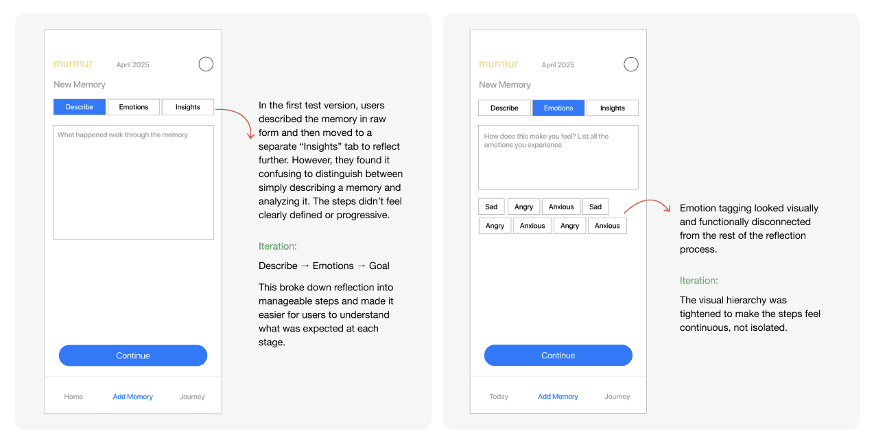 The initial separation of describe and insight created confusion about how the reflection flow progressed. Users weren’t sure what to expect after each AI prompt.