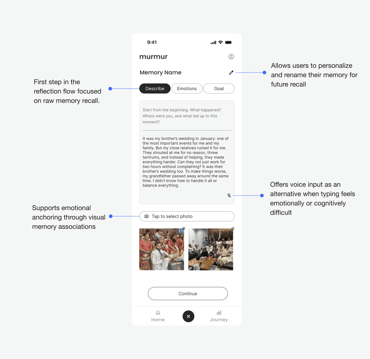 This screen initiates the reflection process by prompting users to capture the memory they want to process. Users can write about their experience, record a voice note, or upload an image that visually represents the moment. The goal is to let users externalize the event in their own way.